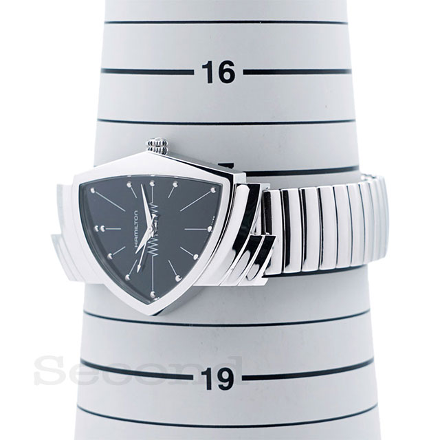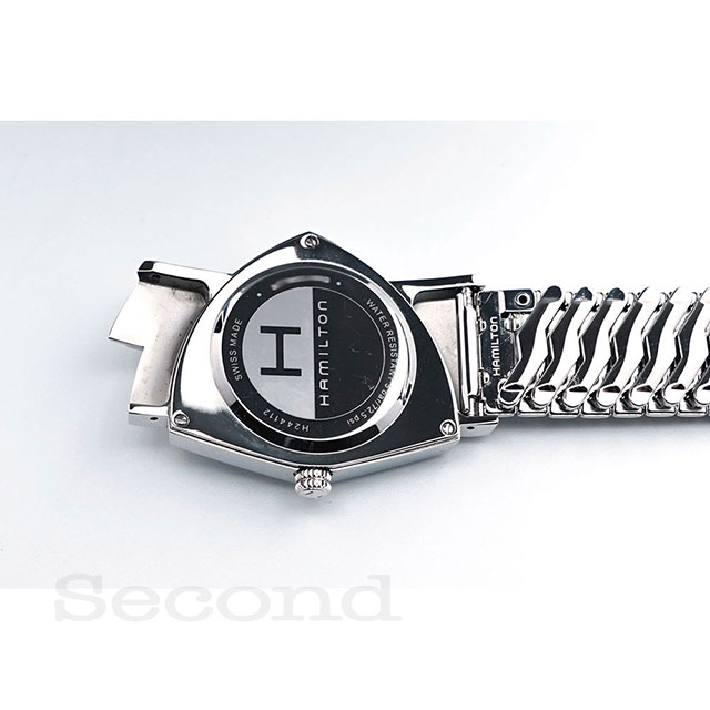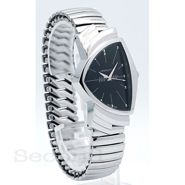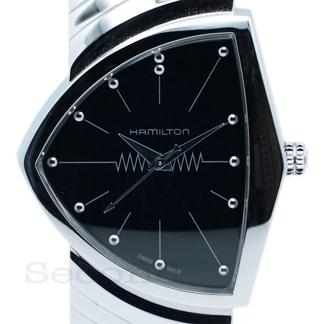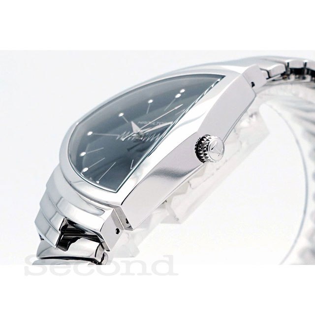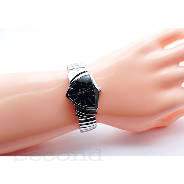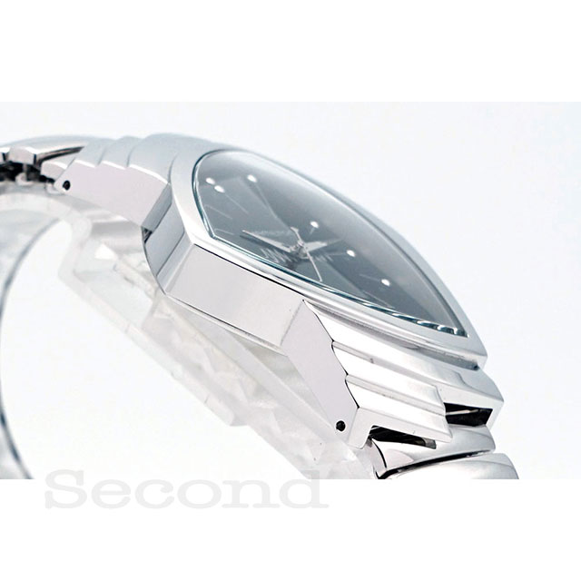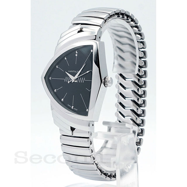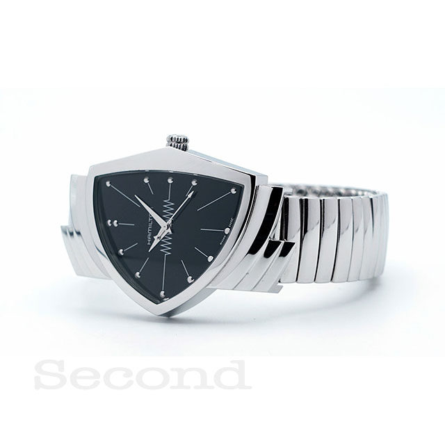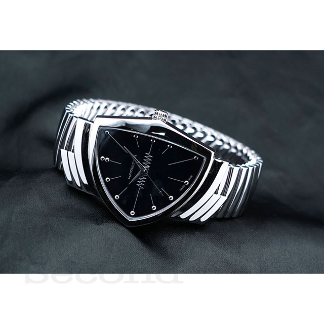 左右非対称のトライアングルケースとツヤのあるブラックダイヤルが前衛的なデザインのクォーツ腕時計。