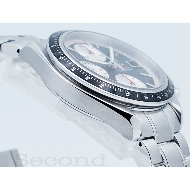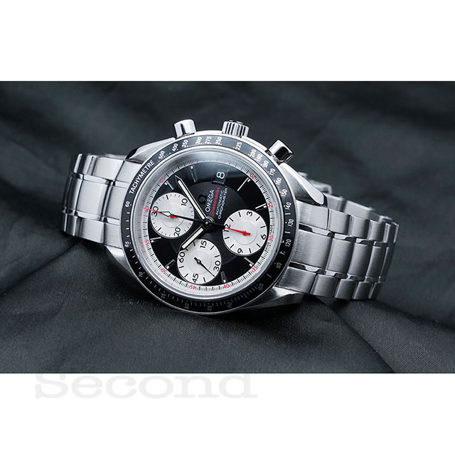 赤をアクセントにホワイトとブラックのツートーンダイヤルに程よくエッジの効いたケースがスポーティークロノグラフ式自動巻腕時計。