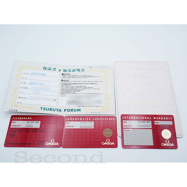 付属品 内・外箱,保証書(無記入),取扱説明書,クロノメーター証明書,ピクトグラム,タグ