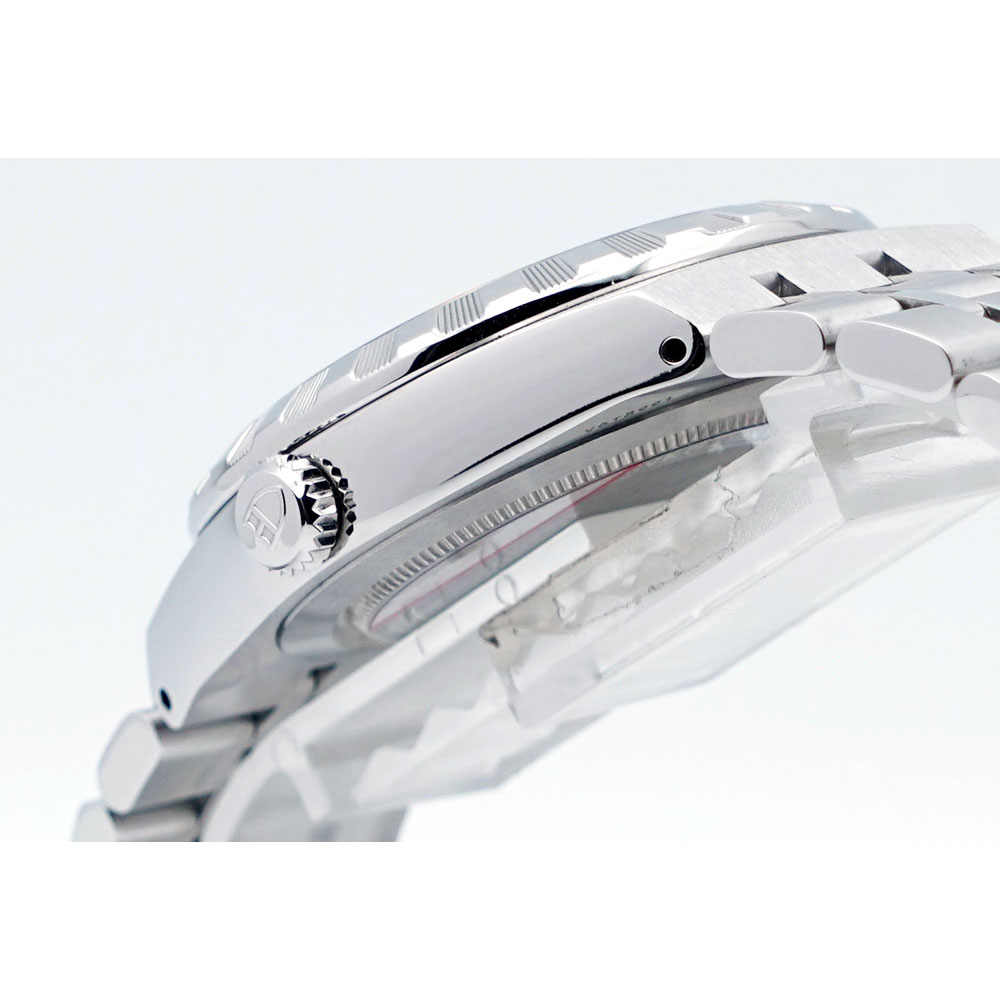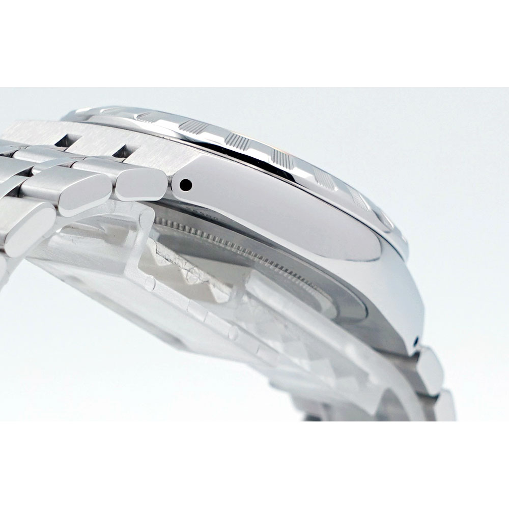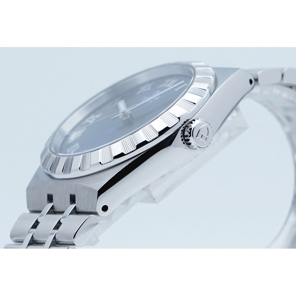 ポリッシュと縦縞を交互に配置したベゼルやローマンインデックスも洗練されたディテールです。