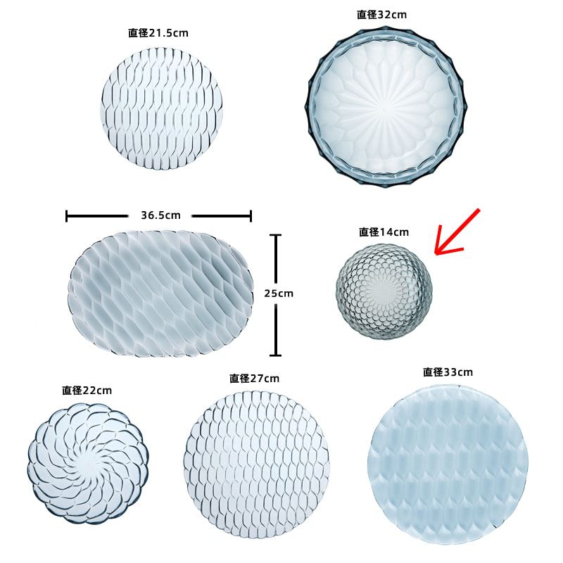 クリスタルガラスやダイヤモンドは、カッティングによって輝きや印象が変わります。このジェリーズも、表面のテクスチャ―デザインへのあくなき研究によって、今までのプラスチック製の食器では考えられなかった、驚きの美しさを実現させました。