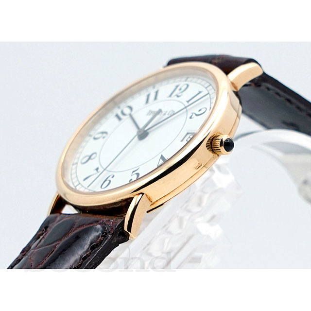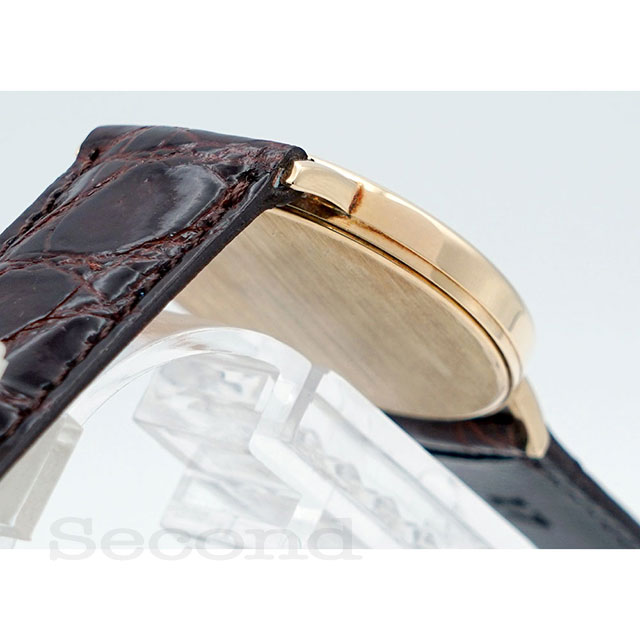 イエローゴールドのシャープなケースにはホワイトダイヤルを採用。