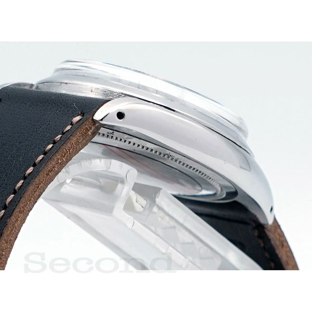 鏡面とヘアラインのメリハリの効いたステンレスケースにブラックダイヤルが渋い雰囲気の手巻腕時計。
