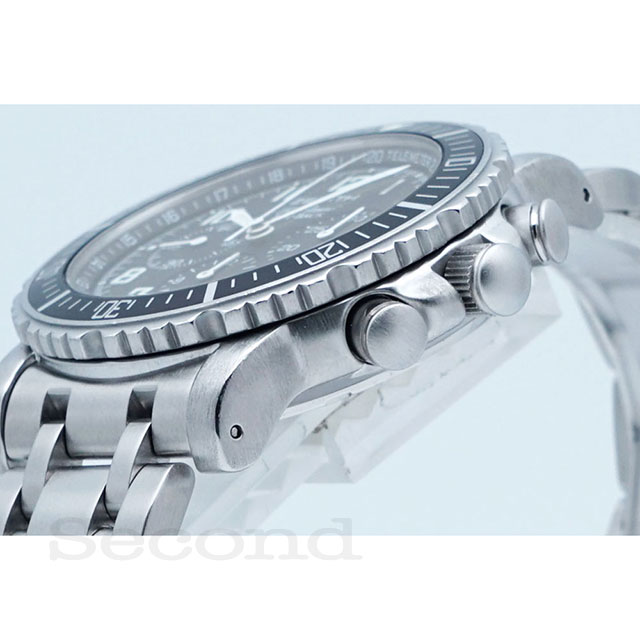ヘアライン仕上げのステンレスケースにブラックダイヤルが力強い印象のクロノグラフ式自動巻腕時計。