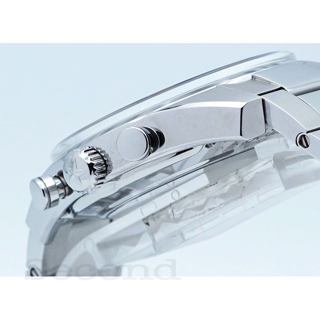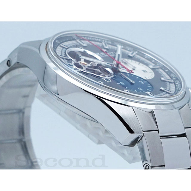 インダイヤルにはシルバー、ネイビー、クロノ針には赤を採用し、グレーダイヤルとの美しいコントラストが魅力のモデルです。