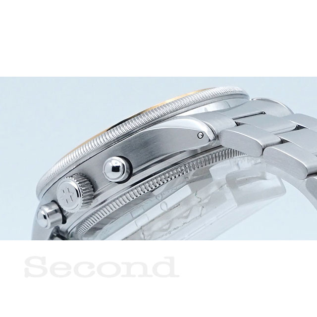 マットな質感のブラックダイヤルにシャンパンカラーのインダイヤルが特徴的なクロノグラフ式自動巻腕時計。