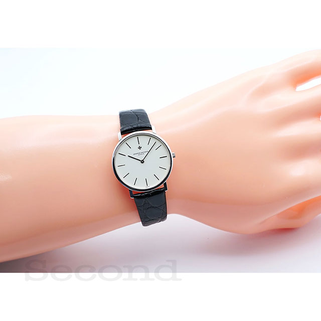 シャープなホワイトゴールケースにマットな質感のホワイトダイヤルがクラシカルな手巻腕時計。