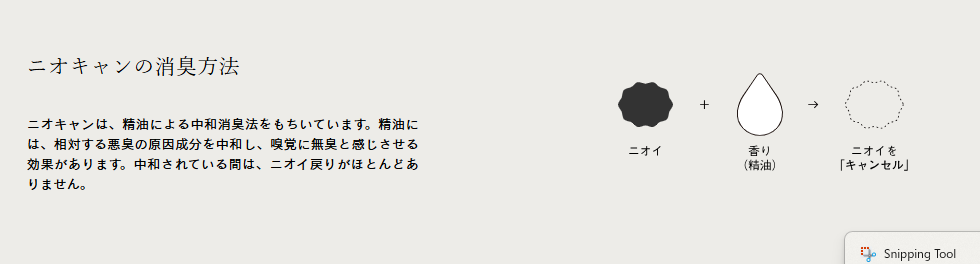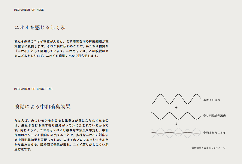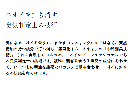 嫌なにおいを強い香りで覆い隠す「マスキング」ではなく、天然製油で打ち消す「中和消臭法」によって、においをキャンセルしてしまうという優れもの。
