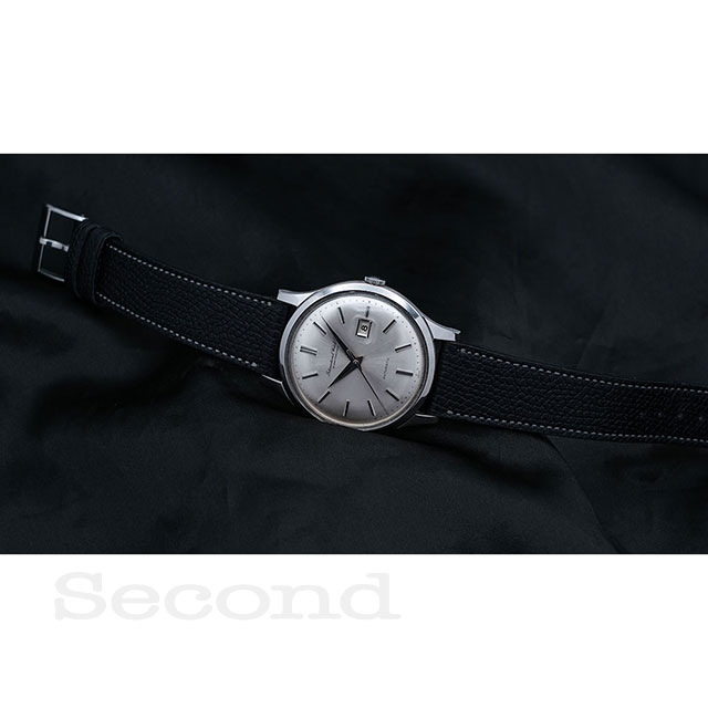筆記体のロゴやシルバーのサンバースト仕上げのダイヤルが高級感のあるミニマルなデザインです。
