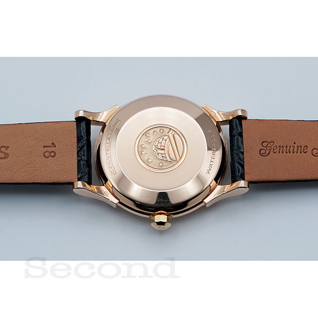 文字盤内のオメガのアップライトロゴとコンステレーションの星のロゴが上品です。